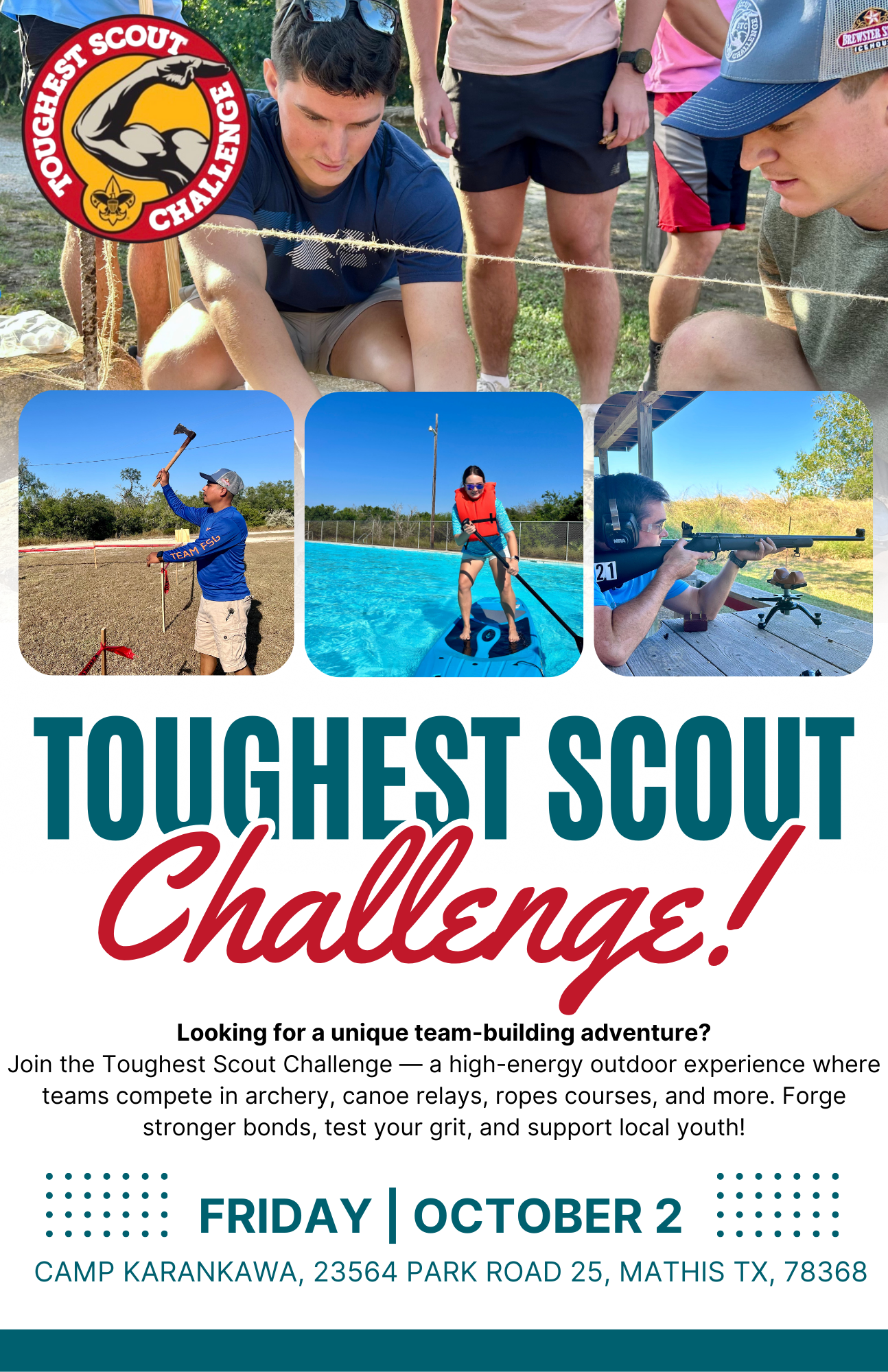 The Toughest Scout Challenge is an outdoor camp experience for organizations and groups to compete against each other and Scouts to raise funds to support the South Texas Council’s efforts to serve the youth of South Texas.